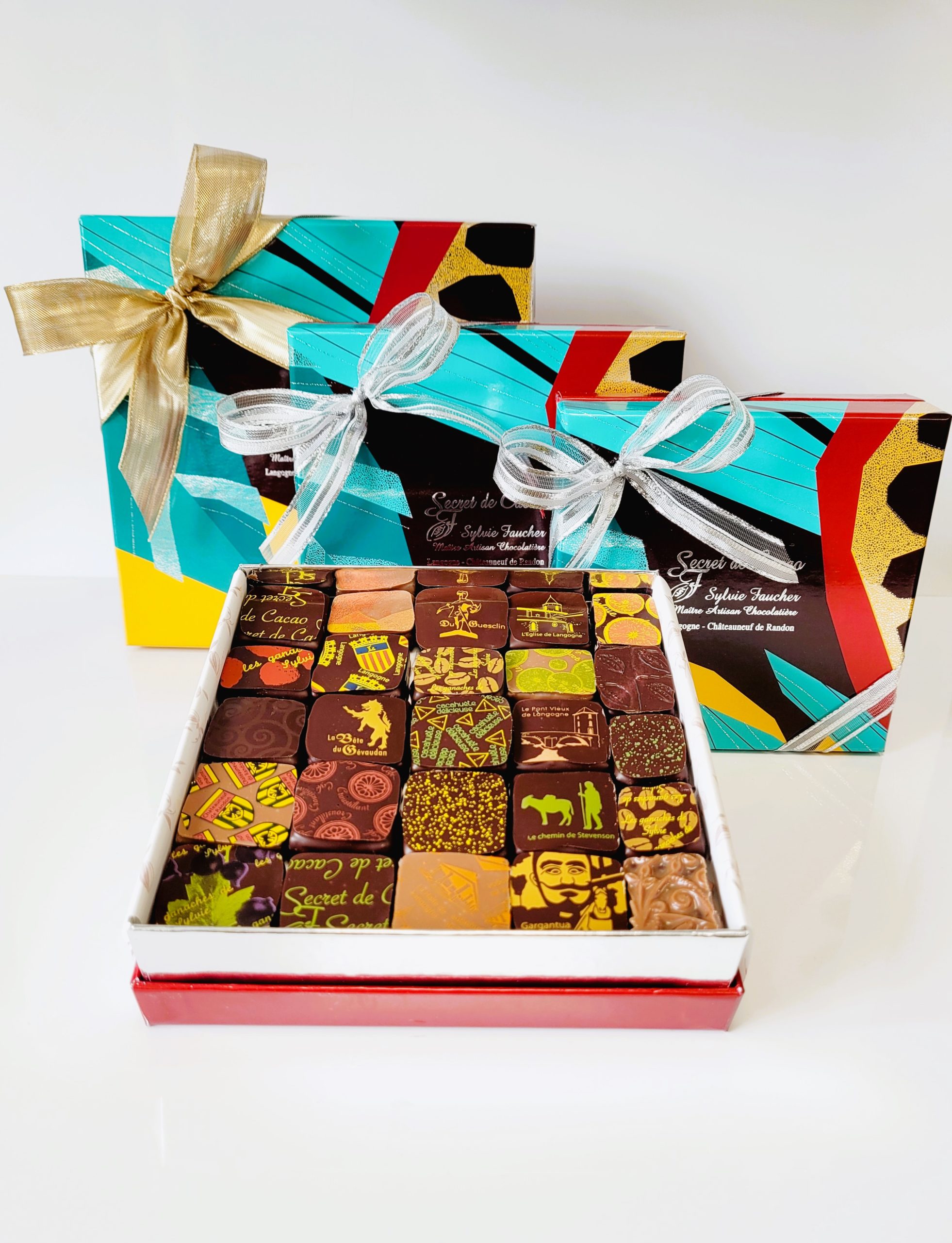 Déclinaison de ganaches « pure origine », parfumées et fruitées, pralinés moelleux et croustillants.