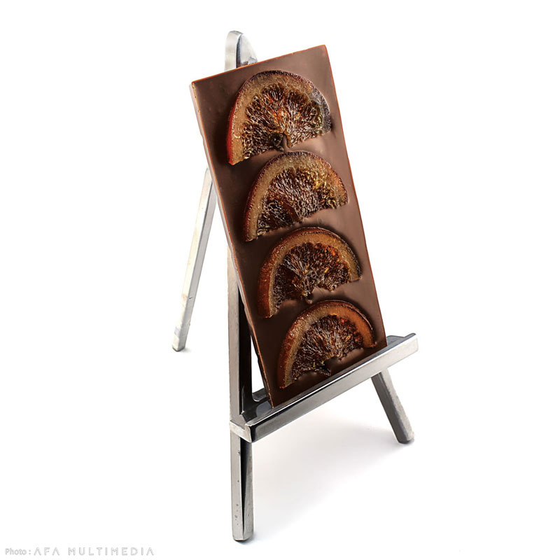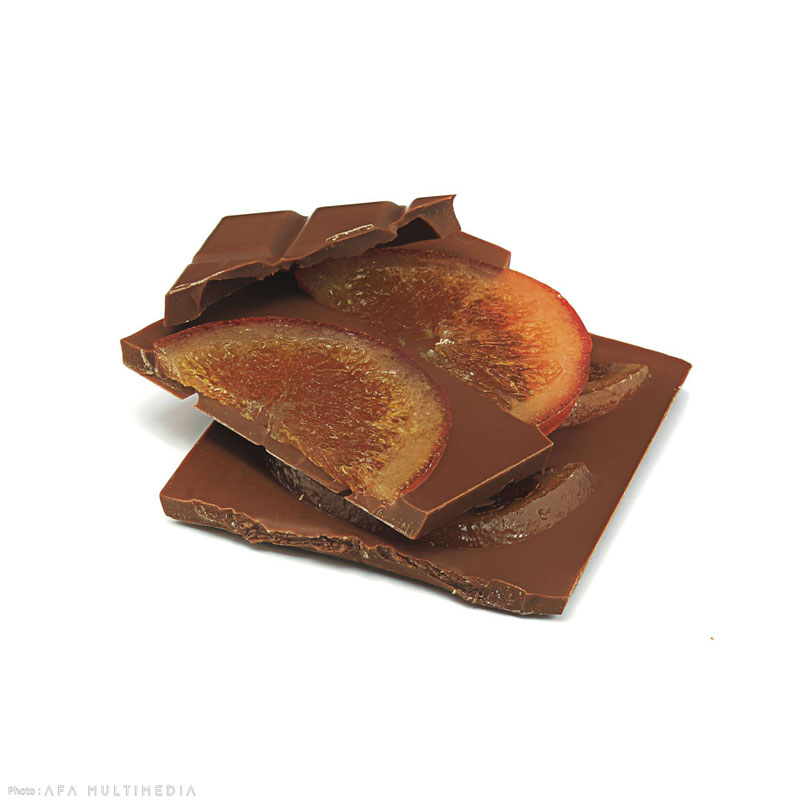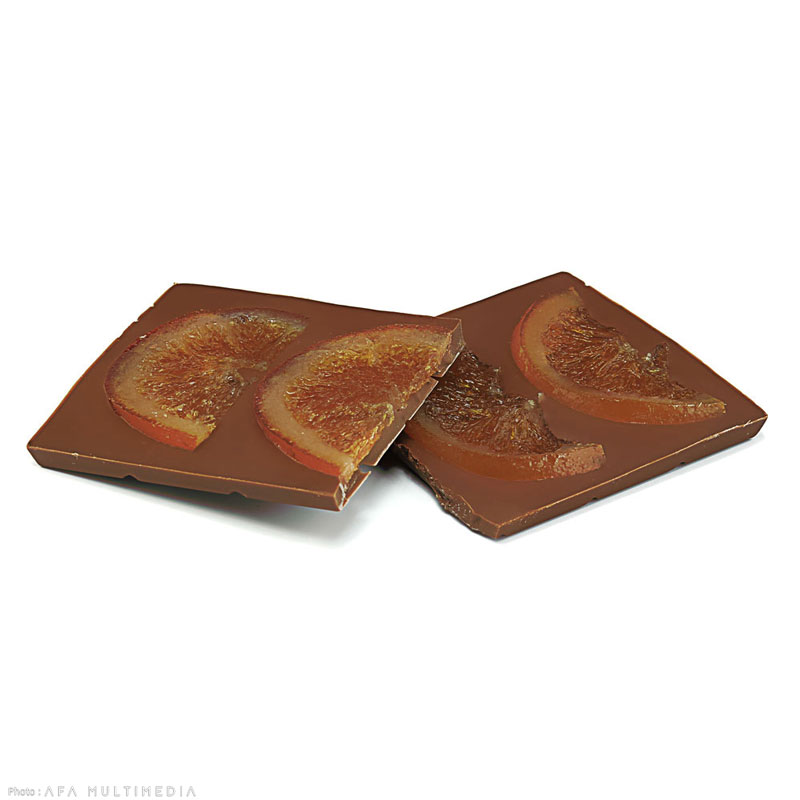 Tablette au chocolat au lait 35,8% de cacao avec des demi tranches d’oranges confites.